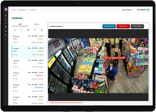 Leverage cutting-edge AI to detect suspicious activities in real-time. The app provides alerts with a stealing probability score, helping to quickly identify and address potential threats. In the example shown, the system has flagged an incident with an 89% probability of theft.